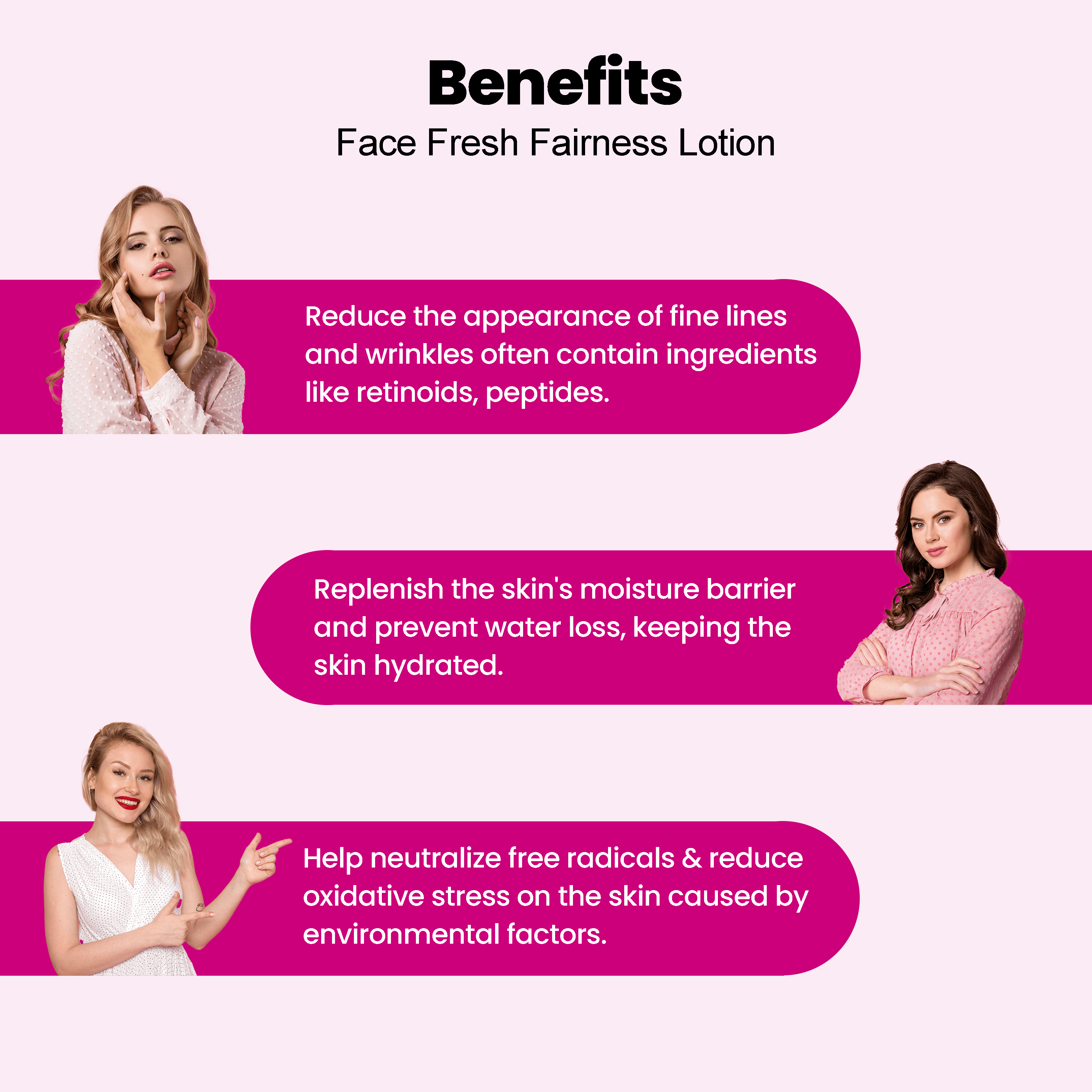 Description: Face Fresh Fairness Lotion works for all kinds of skin e.g. normal, sensitive, Dry, oily or combination Skin. The main ingredients in beauty lotion are humectants, which help to draw moisture into the skin, as well as emollients, which help to keep the moisture in.