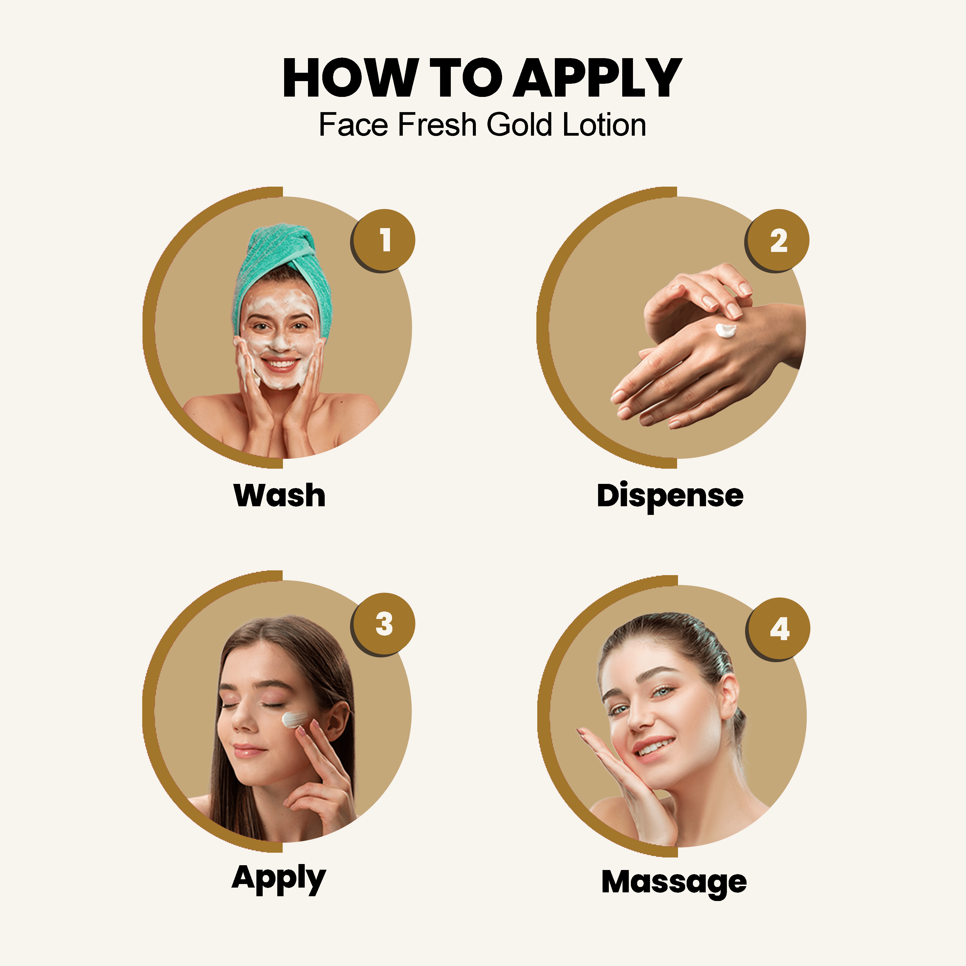 How to use it: Begin by cleansing your face with a Face Fresh Beauty Face Wash or Face Fresh Cleansing Cream. This will remove any dirt or oils that may be present on your skin. Once your face is clean, take a small amount of Face Fresh Gold Plus Beauty Lotion and apply it to your face and neck. You can do this using your fingertips or a cotton pad. Massage the lotion into your skin in circular motions, working from your forehead down to your neck. Allow the lotion to absorb into your skin for a few minutes before applying any other products or makeup.